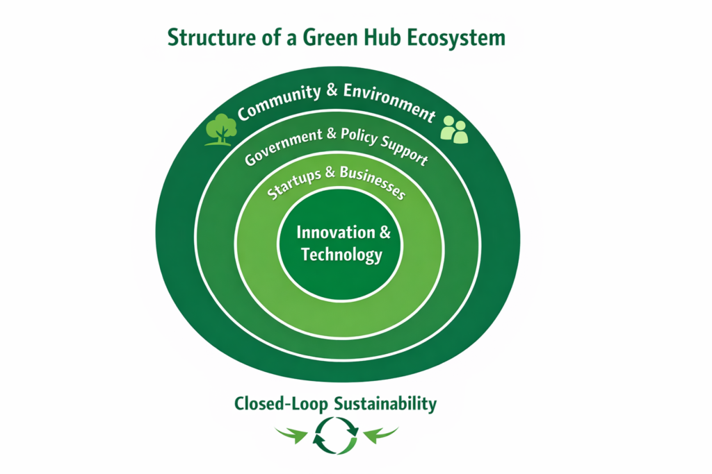 A green hub is not just a physical space; it is an integrated ecosystem. In this system innovation, sustainability, and economic development intersect. These hubs bring together governments, businesses, researchers, and communities to design and implement environmentally responsible solutions.
